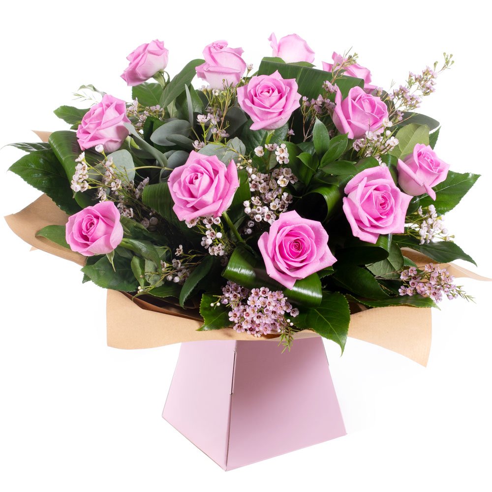 A hand-tied bouquet delivered in water of 12 high quality pink roses and complementary filler wrapped in paper/ cellophane in a box / bag.